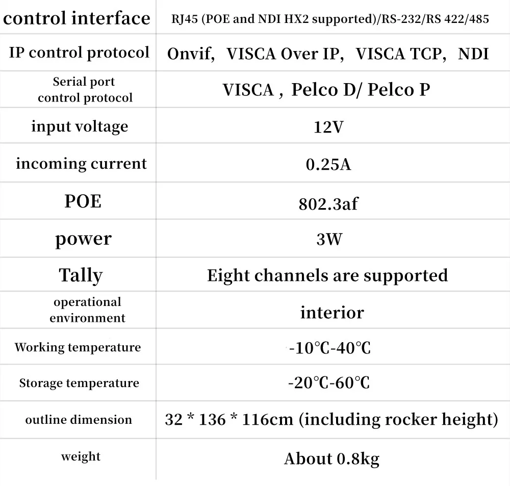 제어 프로토콜: Onvif, VISCA 오버 IP, VISCA TCP, NDI