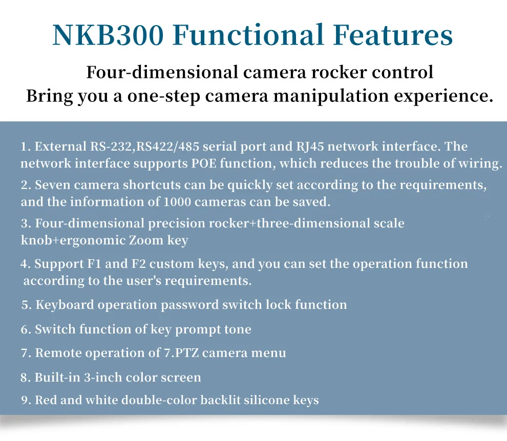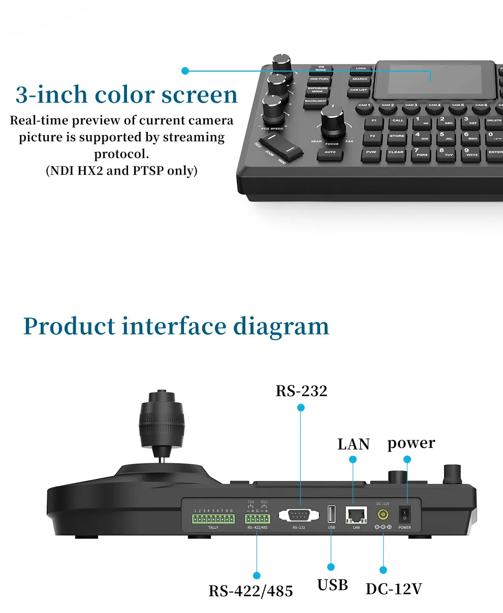 제어 인터페이스: RJ45 (POE 및 NDI HX2 지원), RS-232, RS-422/485IP