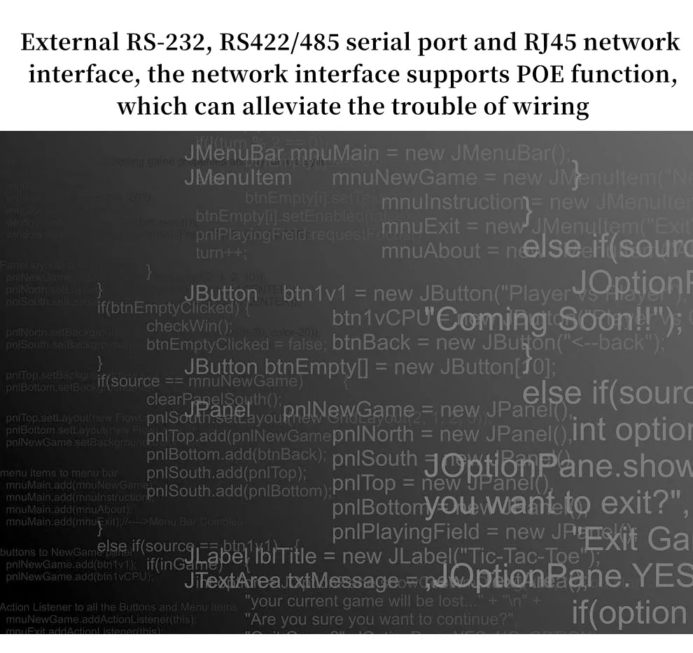 ??외부 RS-232,RS422/485 직렬 포트 및 RJ45 네트워크 인터페이스. 네트워크 인터페이스는 POE 기능을 지원하여 배선 문제를 줄입니다.