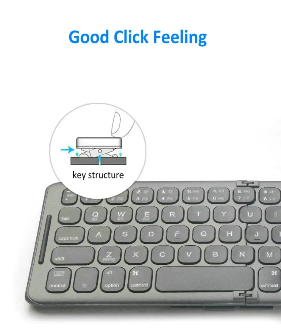 [충전식 배터리]-사용자는 한 번의 충전으로 최대 40 시간의 쓰기 시간에서 즐거움을 얻습니다. 무선 접이식 블루투스 키보드에는 충전식 리튬 이온 배터리가 있습니다. 대기 시간은 최대 90 일입니다.