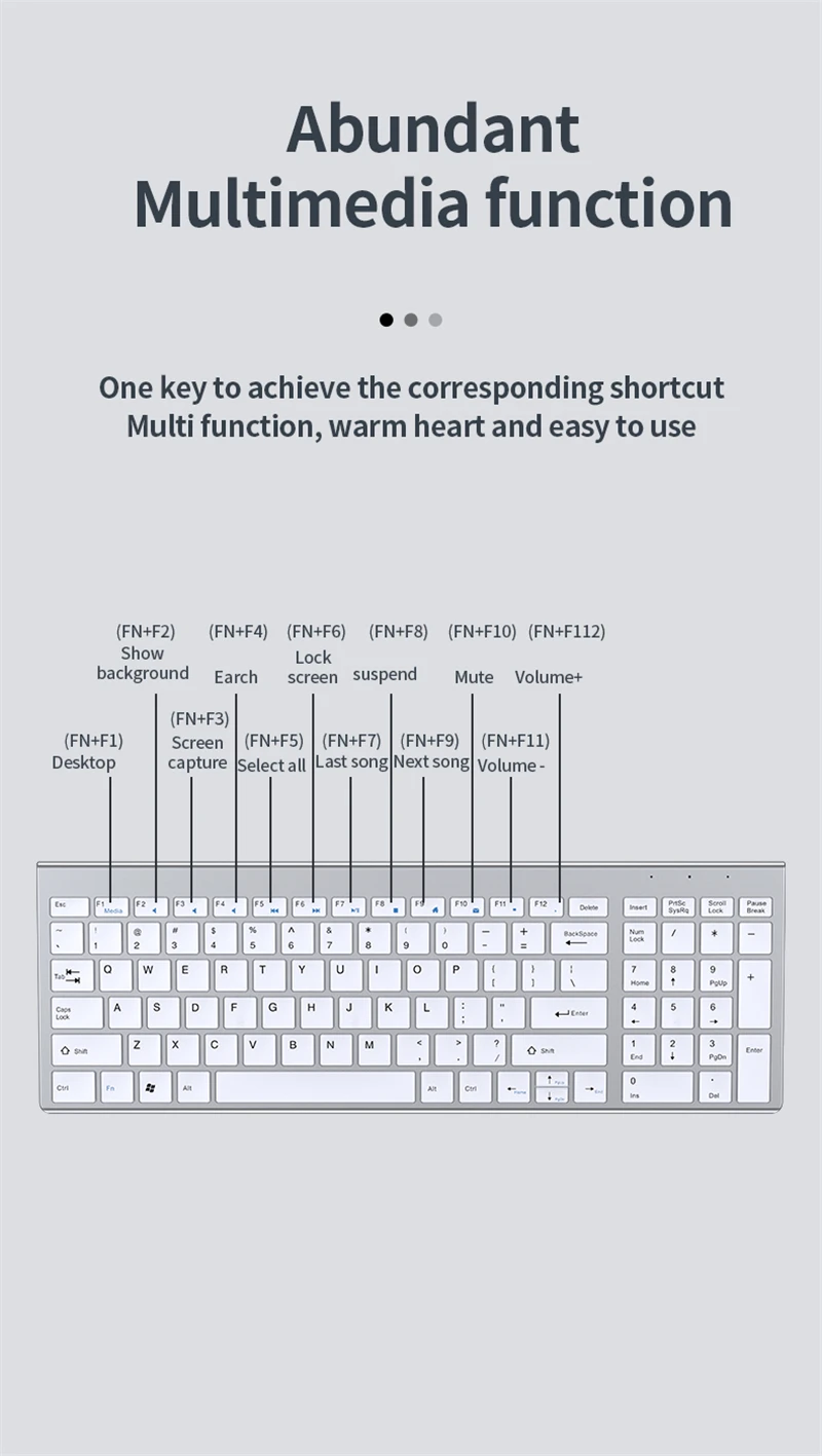 * 초 단위 교차 장치 전환: FN + 1/2/3 (FN + 1: 3.0 블루투스 연결, FN + 2 를 통해 전환, 세 개의 연결된 장치 사이를 신속하게 전환: 블루투스 연결, FN + 3: 무선 2.4G) 5.0 메모리가 자동으로 연결되고 멀티 태스킹 작업이 지연되지 않습니다.