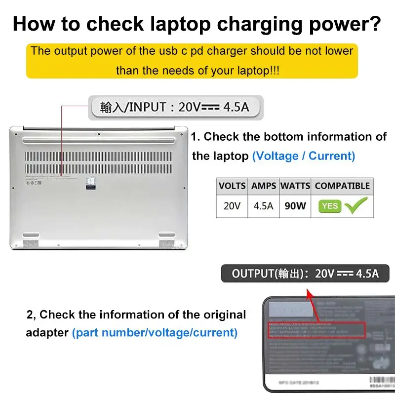 충전기/보조베터리 뒷면 또는 사용 설명서를 확인하여 관련 정보를 찾을 수 있습니다 (예: 충전기 정보가 "출력: 20V = 3.25A "인 경우 이 충전기의 출력 전력은 65W/45W 노트북의 경우 65W (20*3.25) 이지만 90W 노트북의 전원 공급에는 적합하지 않습니다.