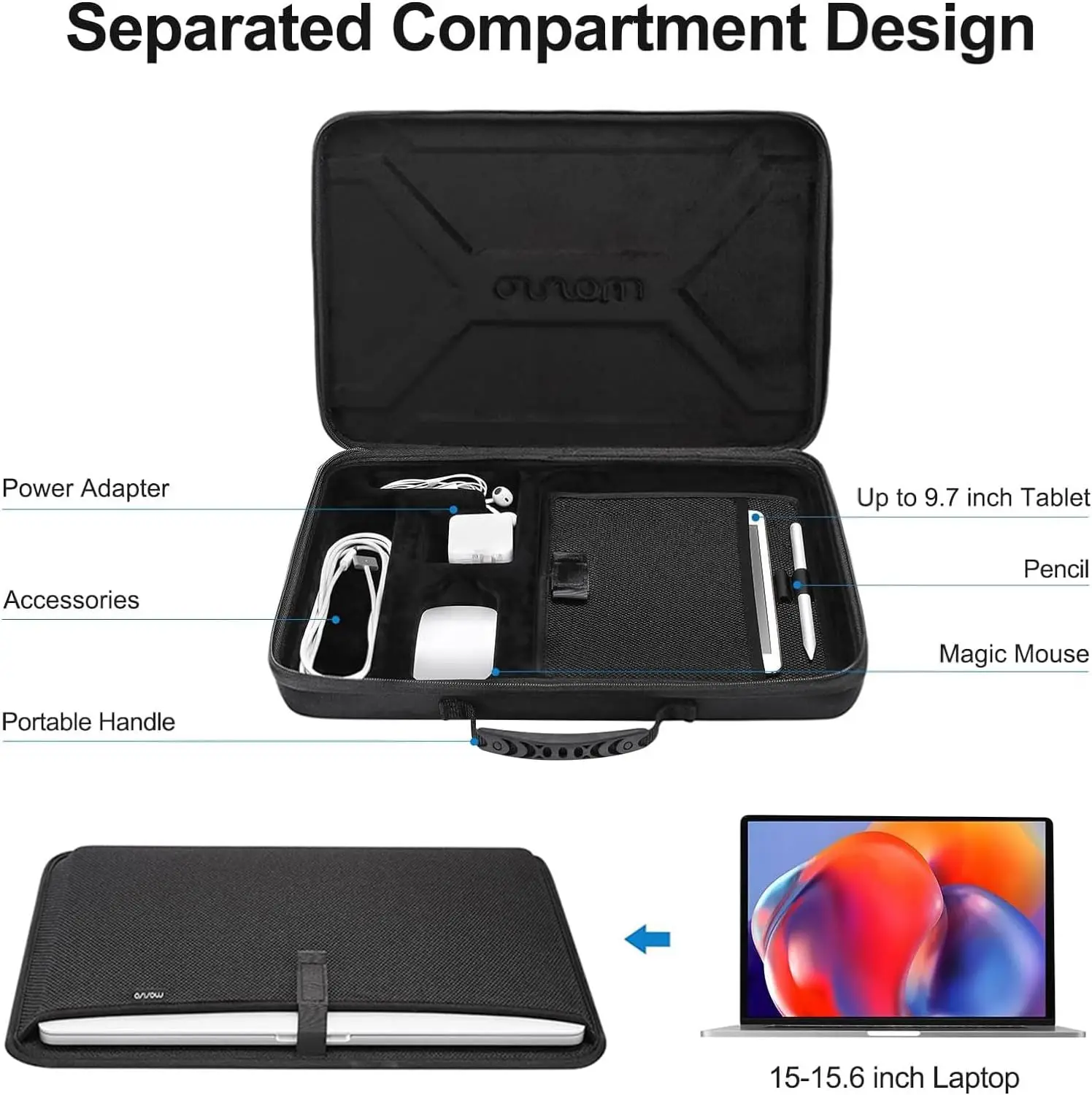 2. 분리 된 구획 디자인. 내부는 별도의 구획으로 충전기, 전원 어댑터, 케이블, 매직 마우스 및 기타 작은 품목을 보관할 수 있습니다. 독특한 디자인으로 노트북과 액세서리의 흠집을 방지하고 액세서리를 보다 체계적이고 편리하며 깔끔하게 유지합니다.
