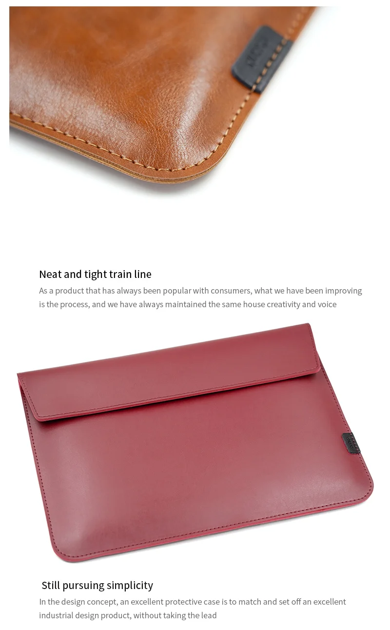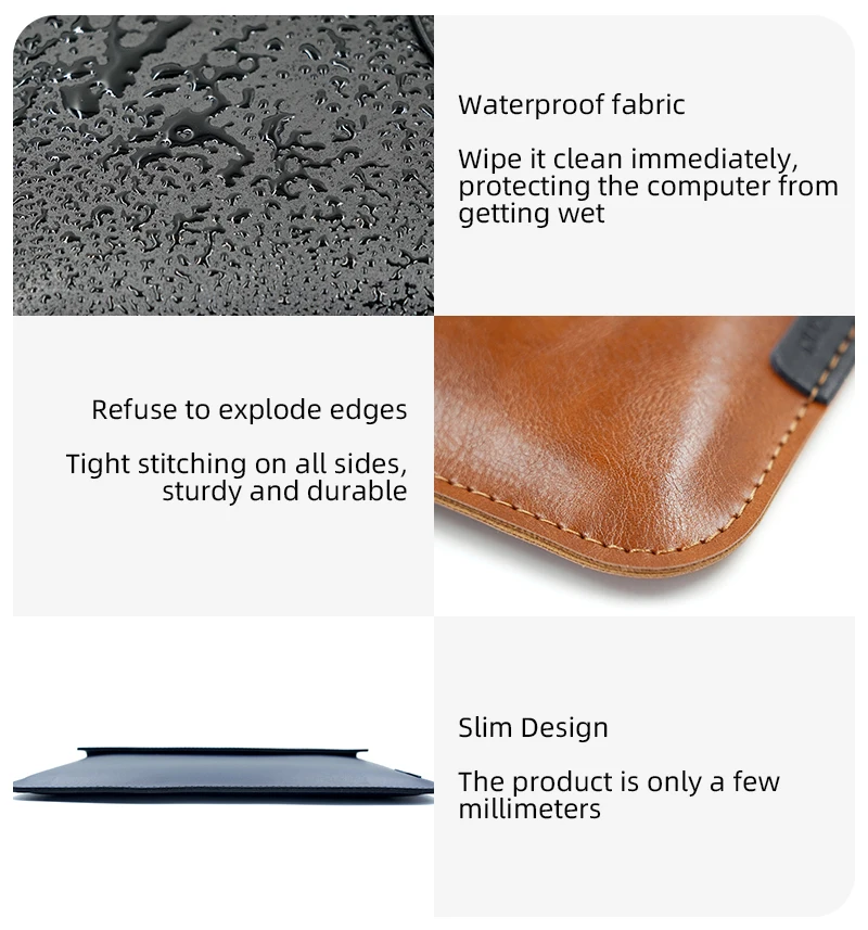 이 노트북 가방은 PU 가죽 소재로 만들어졌으며 가볍고 내구성이 뛰어납니다. 방수 및 내마모성.