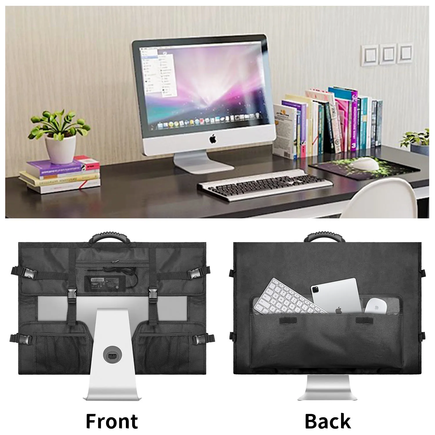 27 인치 iMac 데스크탑 컴퓨터와 호환되는 먼지 덮개 또는 휴대용 가방. 크기 26.25 인치 x 18.35 인치. 멀티 포켓 디자인은 키보드, 마우스, 터치 패드, 마우스 패드, 와이어, 하드 드라이브, 헤드폰 등과 같은 컴퓨터 주변 장치를 효과적으로 구성 할 수 있습니다.