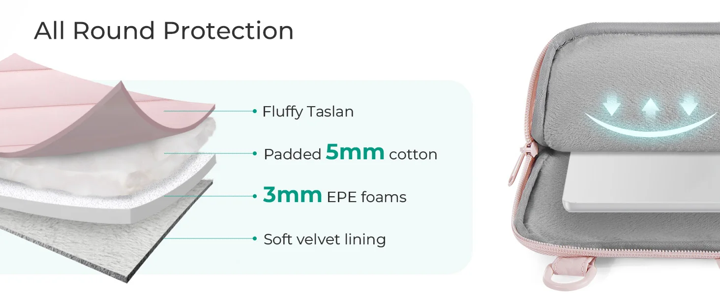 4 층 보호: 이것은 단순한 노트북 가방이 아니라 첨단 기술의 안전 샌드위치입니다! 레이어 1: 푹신한 타슬란 (그 플러시 느낌을 위해). 레이어 2: 5mm 패딩 코튼 (노트북에도 매트리스가 필요하기 때문에). 레이어 3: 3mm EPE 폼 (바운시 성 보호). 레이어 4: 부드러운 벨벳 라이닝 (노트북조차도 사치를 좋아하기 때문에). 함께, 그들은 당신의 소중한 기술을위한 최고의 방어 시스템을 형성합니다. 중세 성과 같지만 MacBook을 위해!