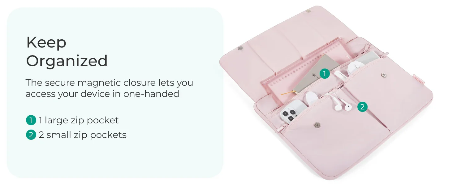 스마트 멀티 포켓: 누가 좋은 포켓 파티를 좋아하지 않습니까? 저희 노트북 슬리브에는 2 개의 지퍼가 달린 앞 주머니와 1 개의 큰 주머니가 제공되어 여러분의 모든 장신구와 보물에 딱 맞습니다. 블루투스 이어 버드, 마우스, 여권, 티슈 또는 iPad를 숨겨서 판단하지 않습니다! 안전을 중시하시는 모든 분들께 안전한 자석 걸쇠를 추가했습니다. 그것은 당신의 소지품을위한 보디 가드 같습니다!