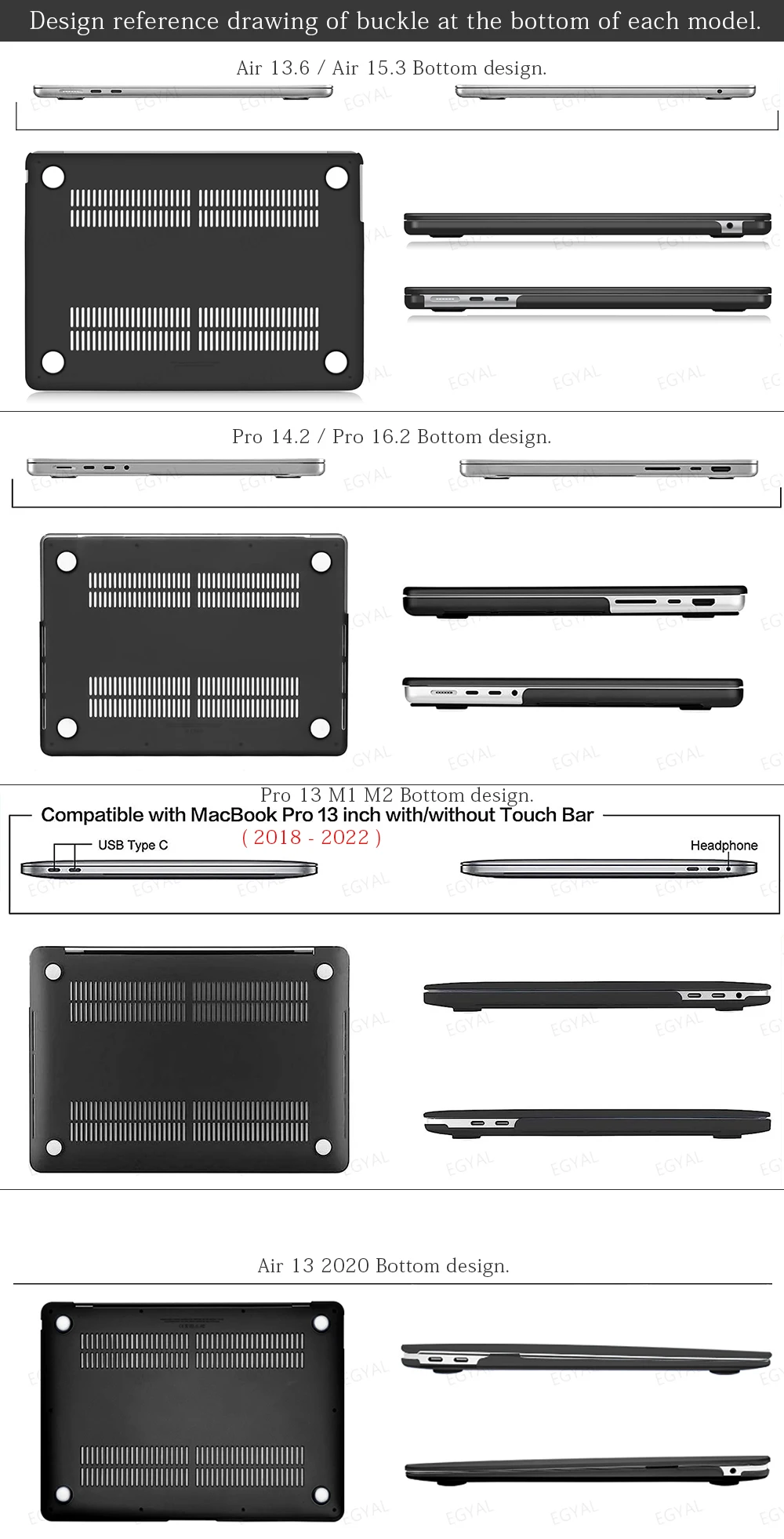 *MacBook M1 M2 M3 케이스는 6 가지 사이즈가 있습니다: ① A2941 A3114 모델의 MacBook Air 15 M2 2023 M3 2024 케이스; ② A2681 A3113 모델의 MacBook Air 13.6 M2 2022 M3 2024 케이스; ③맥북 프로 16 2021-모델 A2485 A2780 A2991 용 2023 M1 M2 M3 16.2 인치 케이스; ④맥북 프로 14 2021-2023 M1 M2 M3 케이스 모델 A2442 A2779 A2918 A2992; ⑤맥북 프로 13 2020-2022 M1 M2 케이스 모델 A2289 A2251 A2338; ⑥ 맥북 에어 13 2020 M1 케이스 모델 A2179 A2337.