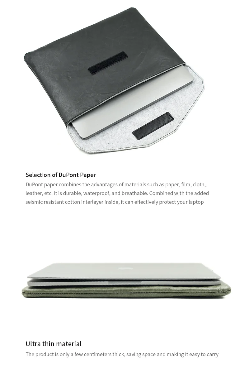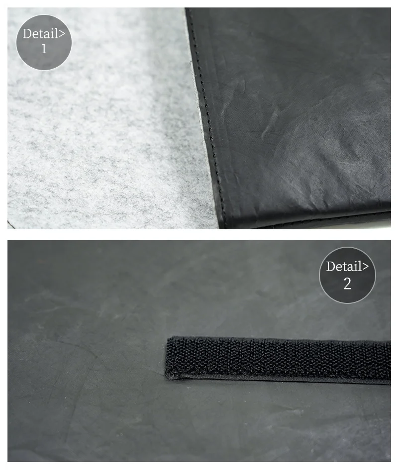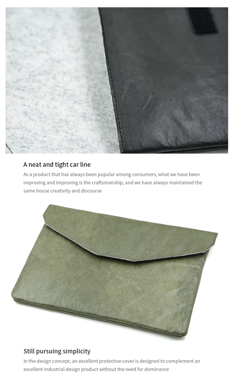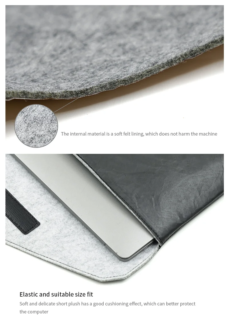 이 노트북 가방은 Tyvek Paper + 펠트 소재로 만들어졌으며 가볍고 내구성이 뛰어납니다. 방수 및 내마모성.