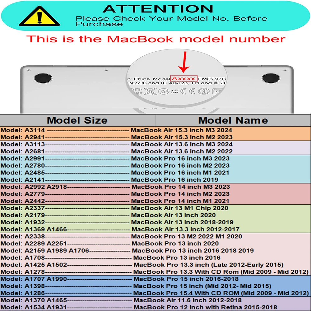 크기가 확실하지 않으면 mcbook의 뒷면을 확인하십시오. 거기에 인쇄 된 모델 (Axxxx) 을 볼 수 있습니다. 다음 비교 표를 사용하여 mcbook에 대한 올바른 표지를 선택하거나 Google에 문의하십시오.