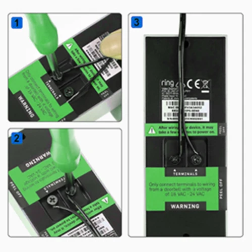 2. 24 볼트 어댑터의 전선을 초인종 장치 용 단자에 설치하십시오 (양 또는 음의 극성에 관계없이 노출 된 두 개의 구리선을 초인종에 연결하고 나사를 조이십시오)