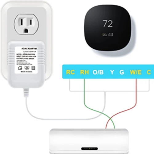 2. 24 볼트 어댑터의 와이어를 "C" 터미널에 설치하고 다른 와이어를 "RC" 터미널에 설치하십시오. HVAC 시스템에 냉각 기능이있는 경우 포함 된 점퍼를 사용하고 "RH" 에서 "RC" 터미널로 연결해야합니다.