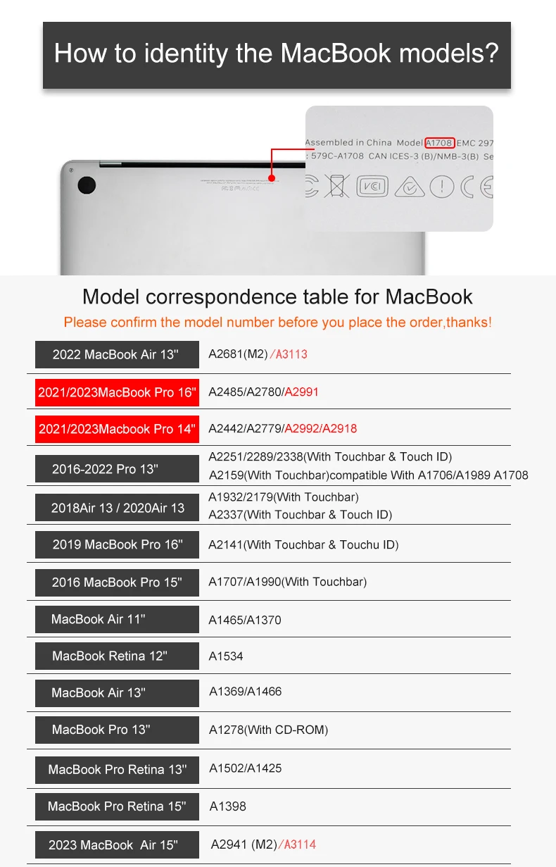 올바른 모델만 노트북과 일치시킬 수 있습니다. 해당 모델 번호 찾으려면 맥북 밑면 확인해주세요.