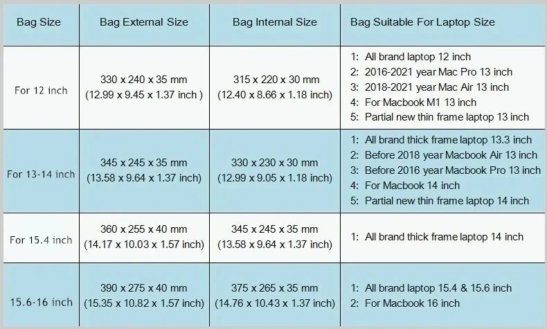 1: 모든 가방은 새로운 얇은 스크린 프레임 랩톱을 위해 느슨한 쓰레기 일 수 있습니다. 큰 공간 가방이 마음에 들지 않으면 pls는 가방 내부 크기와 노트북 외부 크기를 확인해야합니다. 그런 다음 노트북 크기보다 작은 크기의 가방을 주문할 수 있는지 확인하십시오. 2: 어떤 크기의 가방이 노트북에 적합한 지 확실하지 않은 경우 언제든지 저희에게 연락하십시오.
