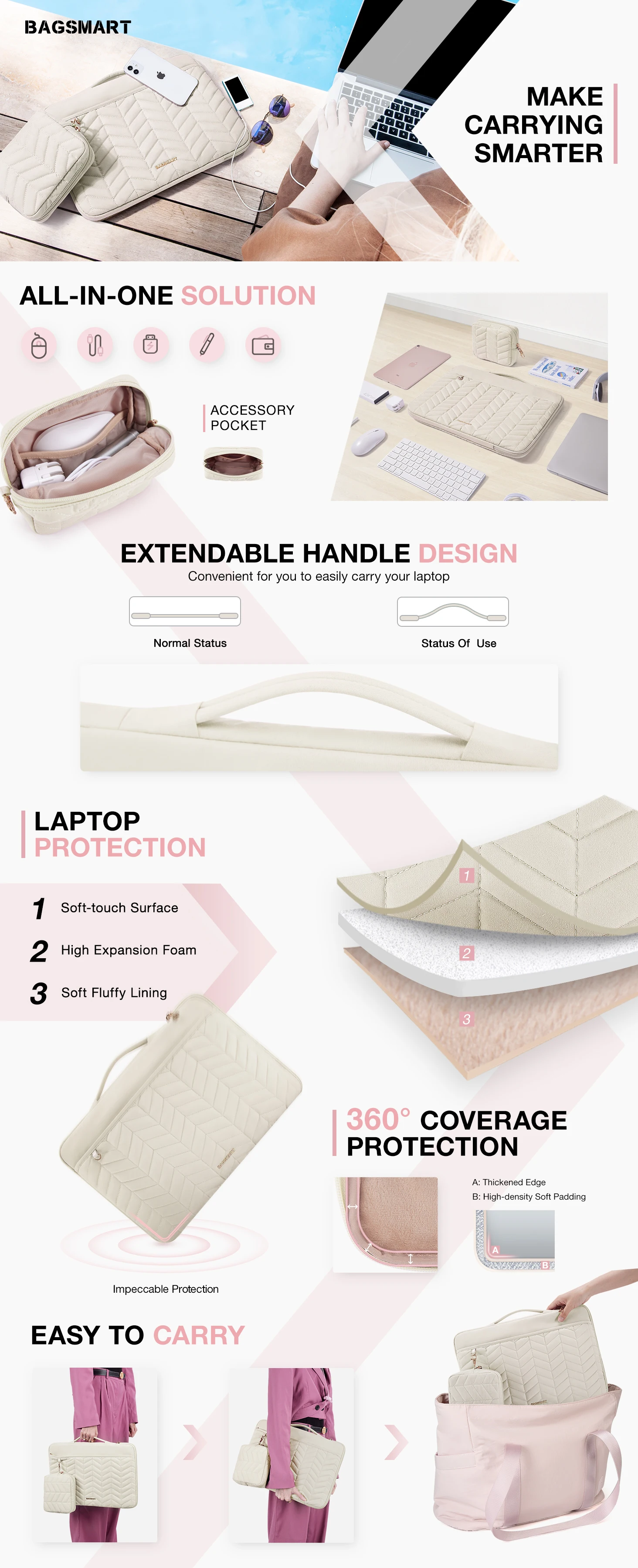 전문 액세서리 가방: 다른 노트북 슬리브와 비교하여 Bagsmart 노트북 슬리브에는 작은 액세서리 가방이 제공되어 마우스, 이어폰 및 메이크업 아이템을 넣을 수 있습니다. 유연한 사용, 휴대용 및 세련된 요구에 맞게 액세서리 백을 제거하거나 설치할 수 있습니다. 컴팩트한 사이즈와 가벼운 디자인으로 이동 중에도 쉽게 가져갈 수 있어 노트북 케이스에 딱 맞는 액세서리입니다.