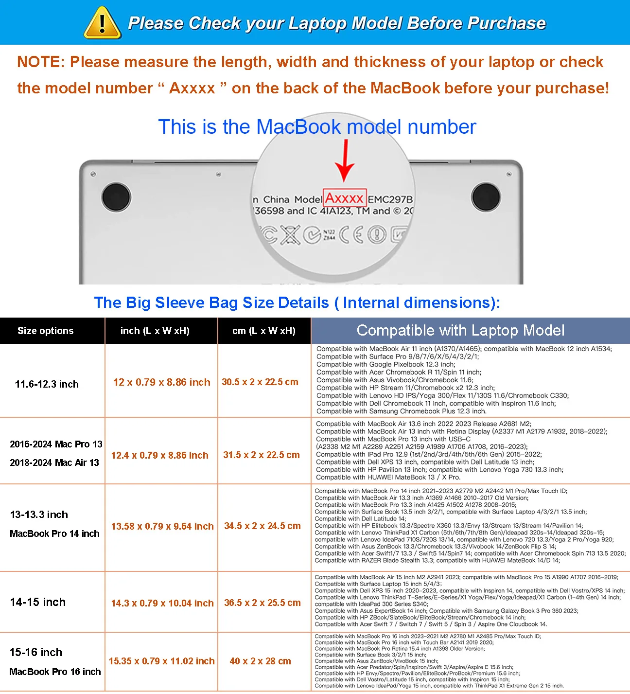 구입하기 전에 노트북의 길이, 너비 및 두께를 측정하거나 Macbook 뒷면의 모델 번호 "Axxxx" 를 확인하십시오! 수동 측정 때문에 1-5mm 오차를 허용하십시오. 감사합니다!