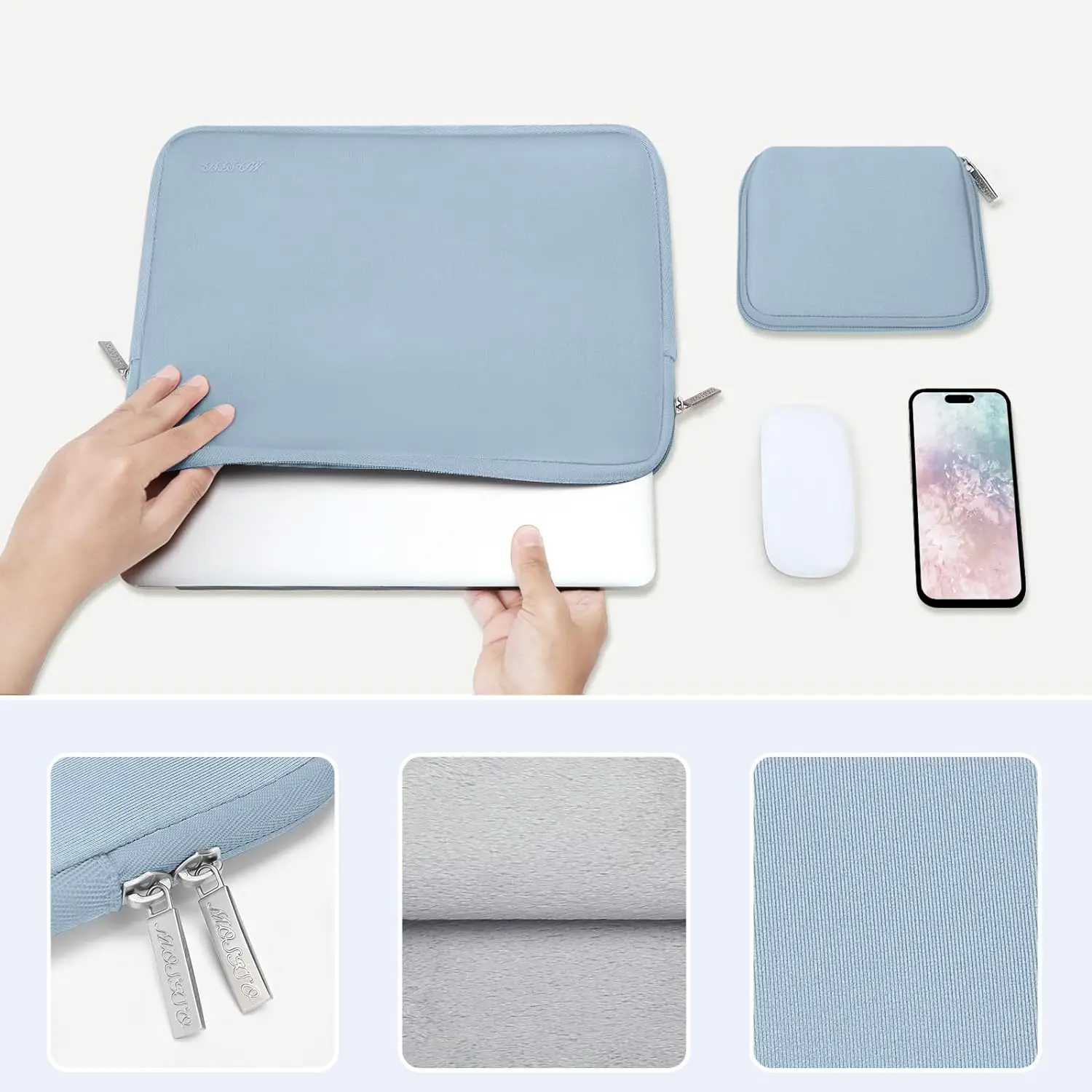 노트북 마우스와 이어폰을 보관할 수있는 추가 소형 수납 파우치 백. 큰 소매 가방과 같은 색상, 조화 및 세련된. 작은 주머니가 있는 보호용 휴대용 슬리브 케이스 커버 백은 노트북을 꺼내기에 이상적입니다.