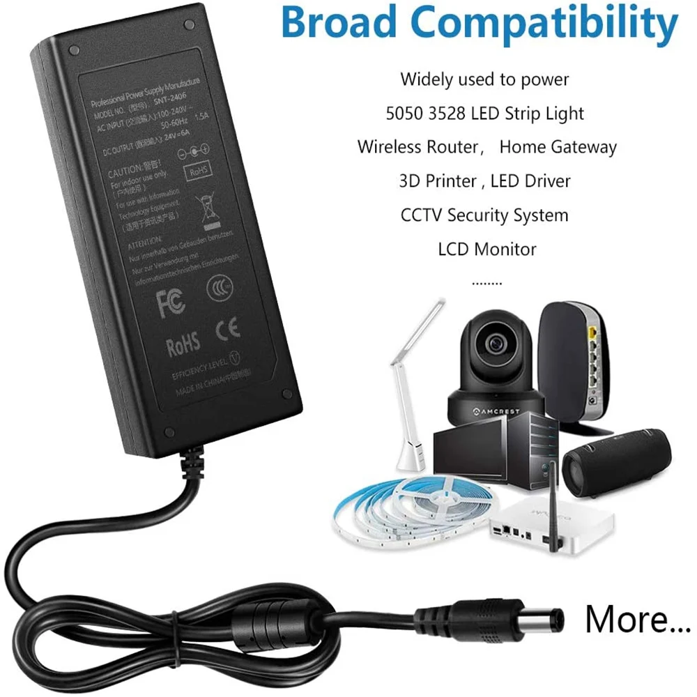 【전원 어댑터 스펙】 입력: AC 100V-240V 50/60Hz; 출력: DC 24V, 6A 최대, 144W; DC 플러그 크기는 5.5mm x 2.1 mm입니다. AC 코드의 길이: 3.94ft/1.2m. Auplf 24v dc 전원 공급 장치는 4A, 3A, 1A, 800mA, 500mA 와 같이 6A 미만을 끌어 당기는 장치에서 작동합니다.