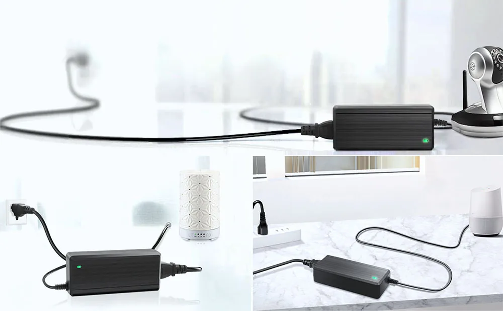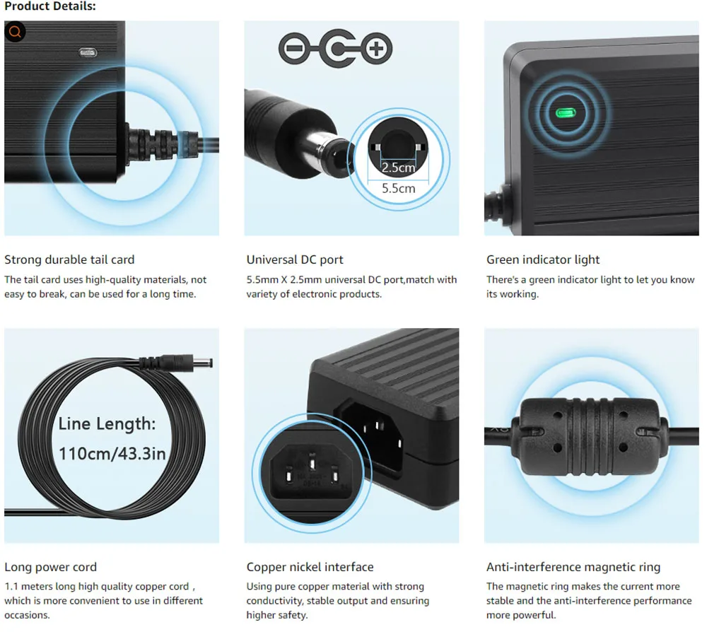 출력은 2.1mm DC 플러그에 연결됩니다. 녹색 LED 표시등 있어요.