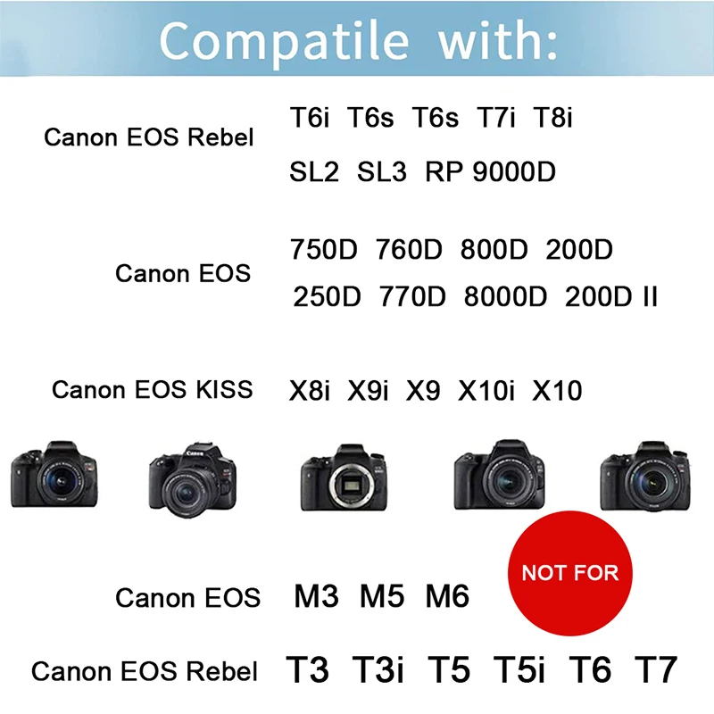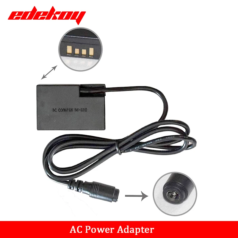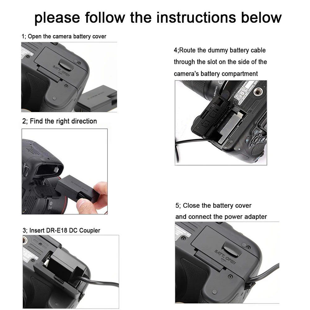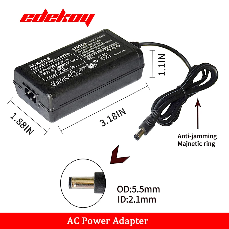 당사의 새로운 ACK-E18 전원 어댑터 키트는 배터리 전력을 절약하고 배터리 충전 중단 시간을 줄이기위한 이상적인 고품질 저비용 솔루션이며 이미지를 컴퓨터로 다운로드하거나 사진을 인쇄 할 때 사용해야합니다. 또는 집에서 사진을 촬영. 키트에는 AC-E6 어댑터, DR-E18 DC 커플러 (더미 배터리) 및 전원 코드가 들어 있습니다. ACK-E18 다음 카메라와 호환됩니다.