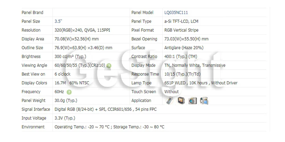 고해상도: 230,400 도트 (320RGB x 240). LQ035NC111 은 무정형 박막 트랜지스터 (TFT) 를 스위칭 장치로 사용하는 투과형 컬러 액티브 매트릭스 액정 디스플레이 (LCD) 입니다.