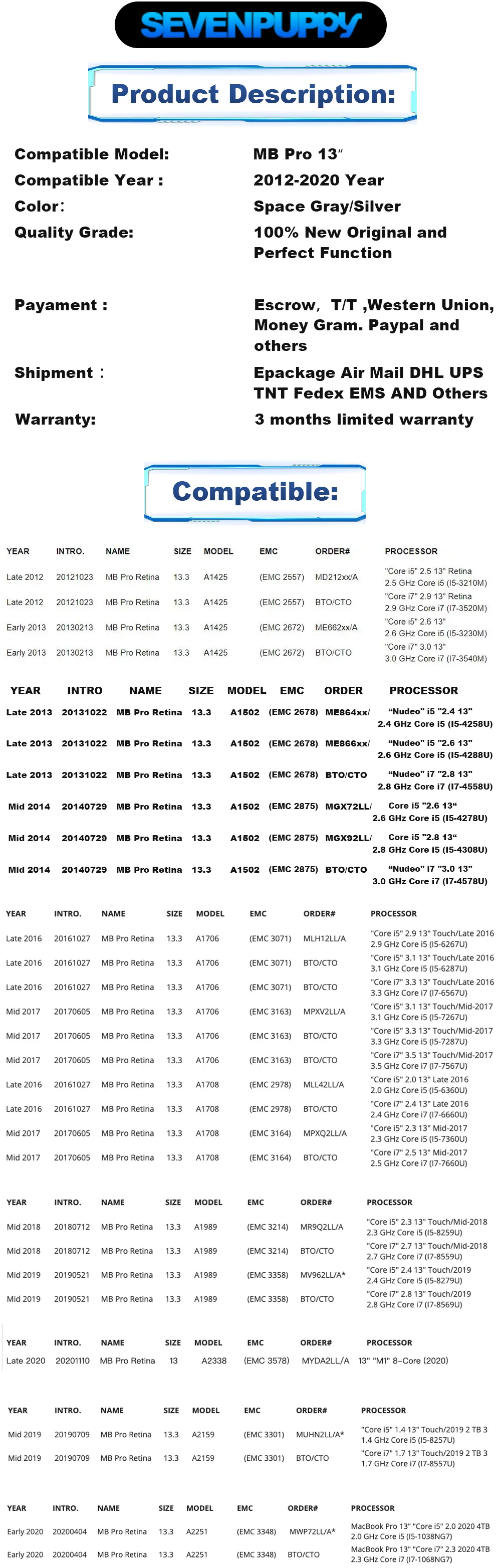 맥북 프로용 마쿠지 세븐 퍼피 2012 2020 교체 13 인치 A1425 A1502 A1706 A1708 A1989 A2159 A2251 A2289