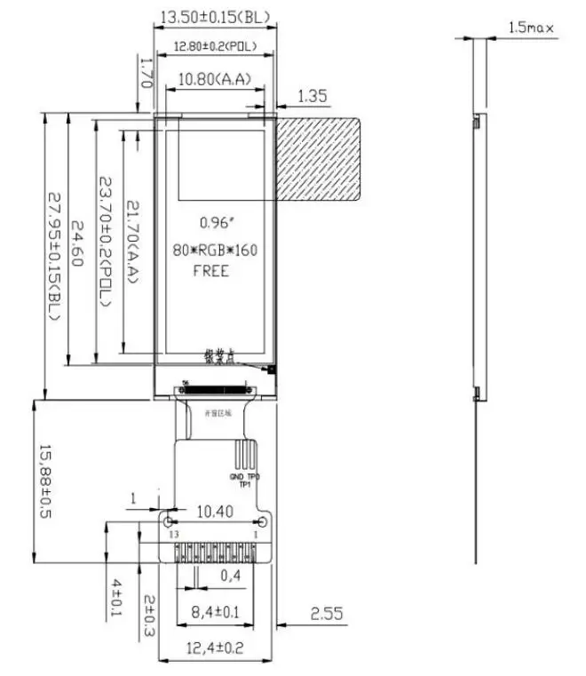 물리적 크기: 13.50(W)* 27.95(H)* 1.5 +/-0.1(T) (FPC는 포함하지 않음)