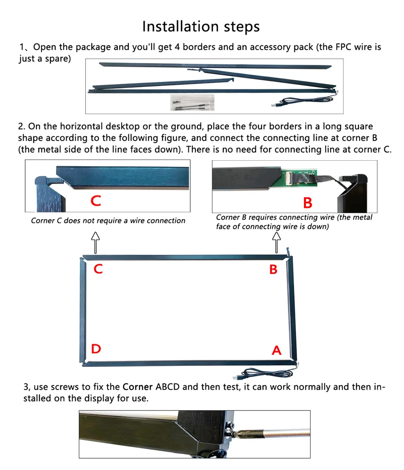 1. 디스플레이 없음, 모니터 없음, 화면 없음. 이 터치 오버레이는 디스플레이가 아니며 터치 포인팅 장치이며 터치 기능 오버레이 전용입니다. 모니터 또는 TV 화면 앞에 설치해야합니다.