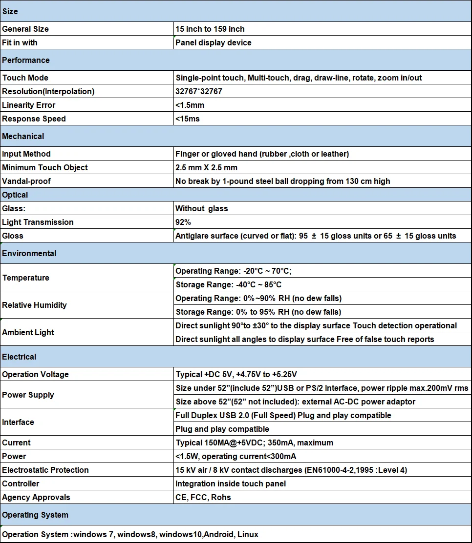 50 인치 20 포인트 IR 멀티 터치 스크린 프레임 사양: