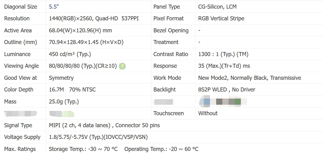 인터페이스 유형: MIPI (2 ch, 4 데이터 레인) , 50 핀 커넥터.