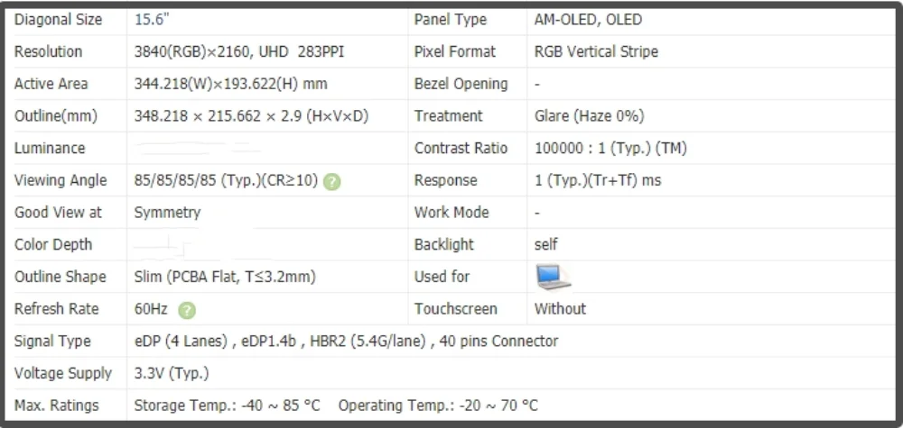 ATNA56WR18 15.6 인치 OLED 스크린 노트북 디스플레이 AMOLED IPS 패널 4K UHD 3840x2160 EDP 40 핀 60Hz