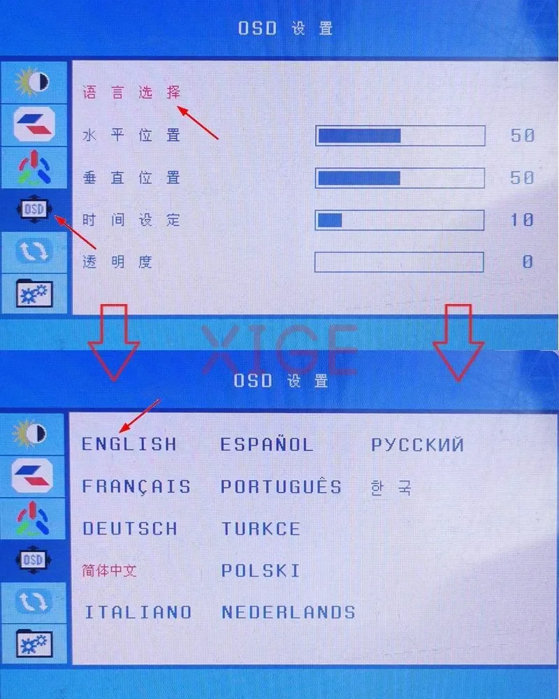 6. 스크린 케이블 연결 및 언어 설정은 아래 사진을 참조하십시오. (OSD 메뉴에는 여러 인터페이스가 있습니다. 다른 경우 저희에게 연락하십시오)