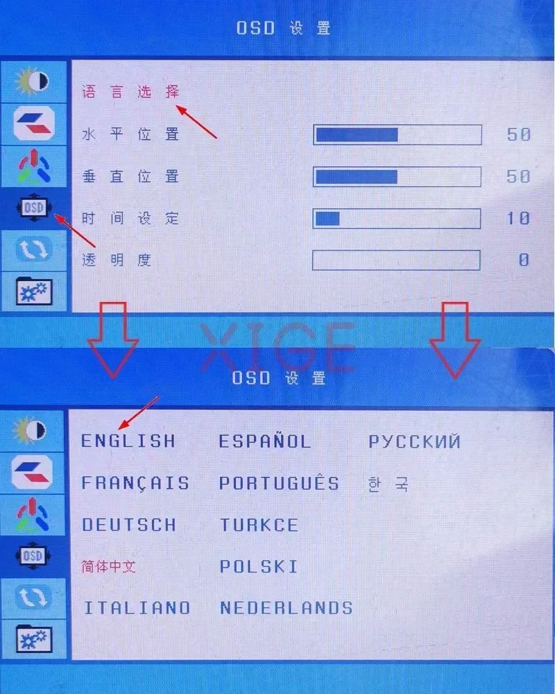 6. 스크린 케이블 연결 및 언어 설정은 아래 사진을 참조하십시오. (OSD 메뉴에는 여러 인터페이스가 있습니다. 다른 경우 저희에게 연락하십시오)