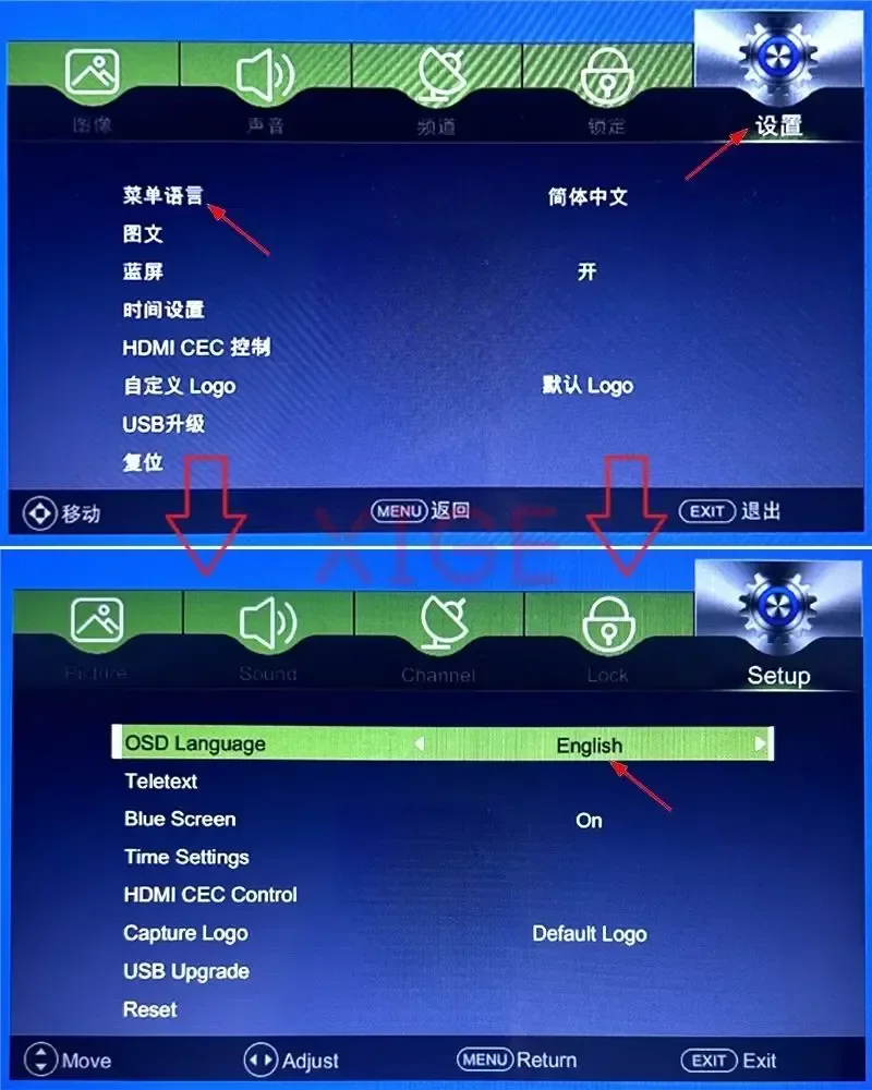 6. 스크린 케이블 연결 및 언어 설정은 아래 사진을 참조하십시오. (OSD 메뉴에는 여러 인터페이스가 있습니다. 다른 경우 저희에게 연락하십시오)