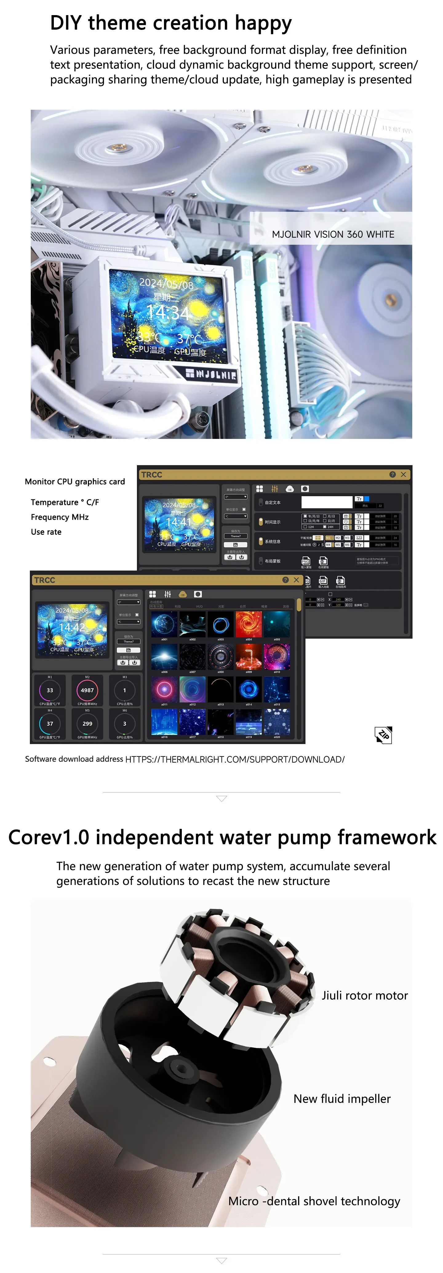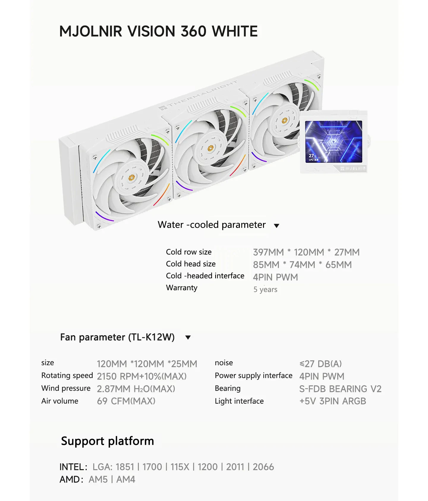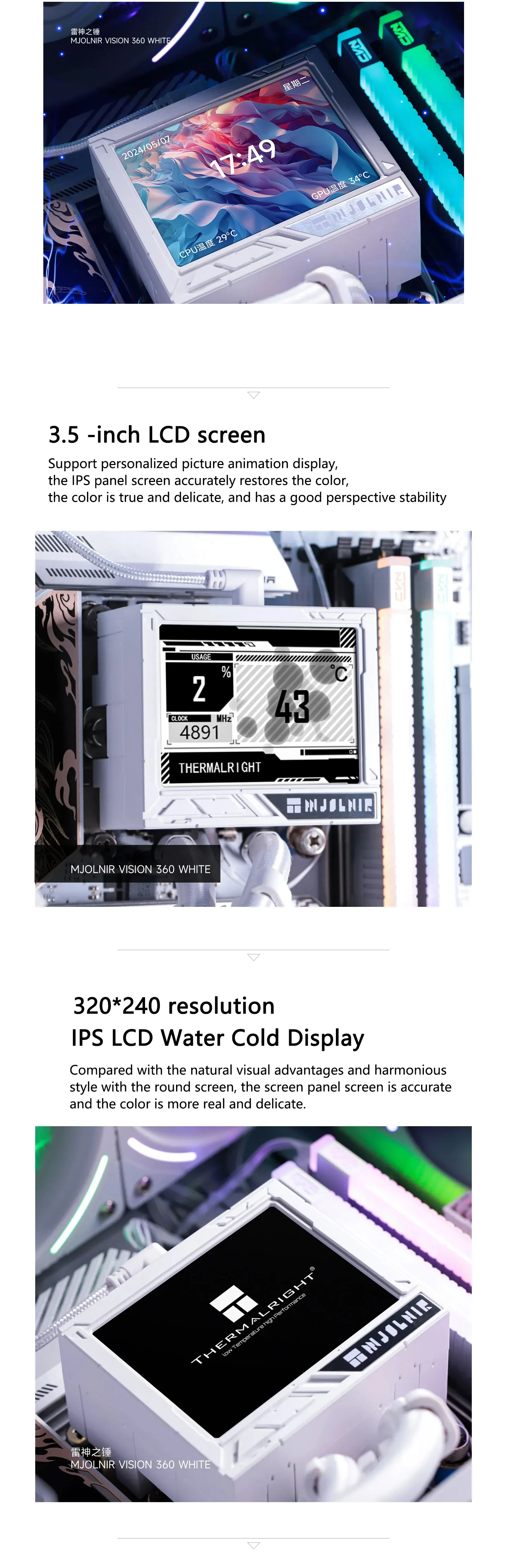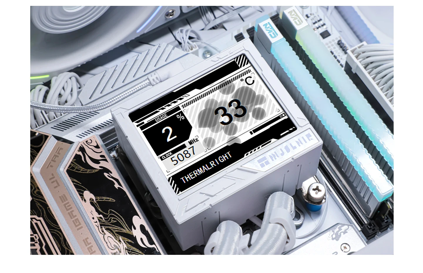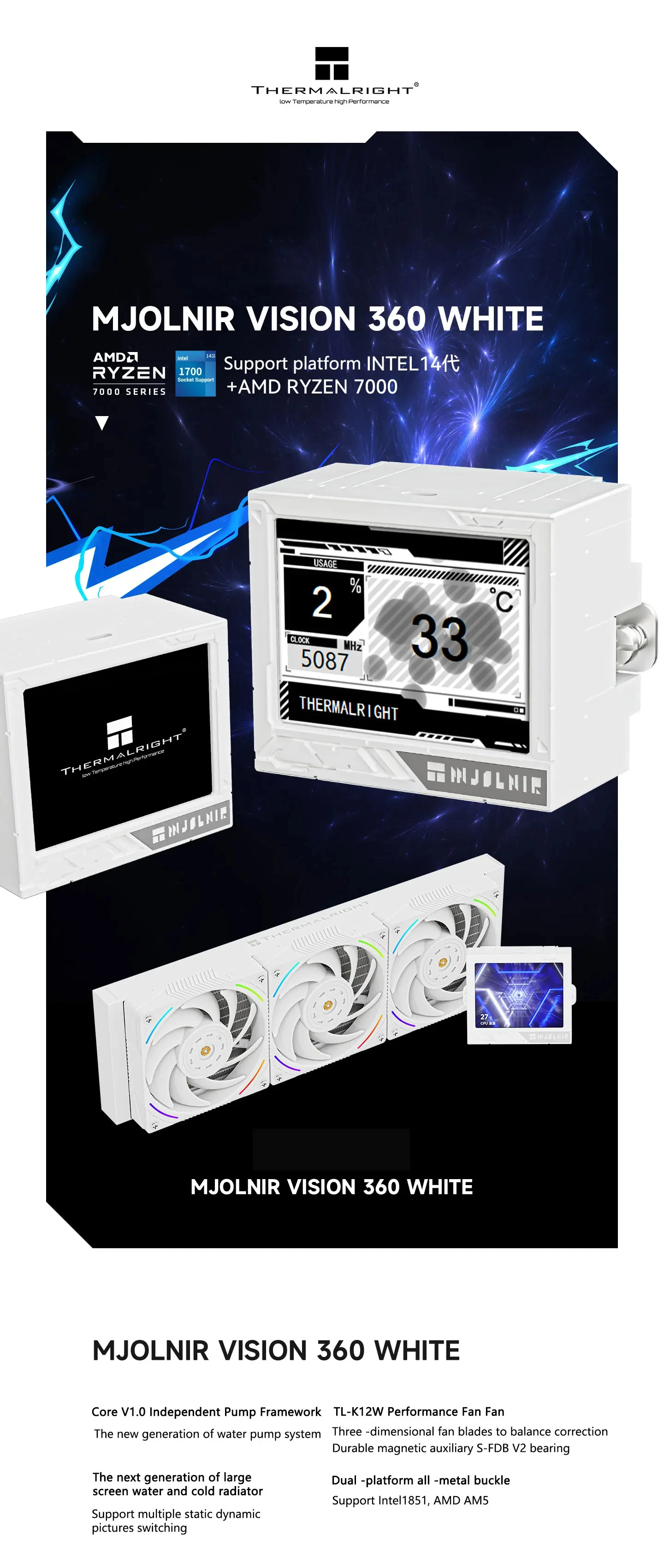 써멀라이트 MJOLNIR VISION 360 ARGB 수냉식 3.5 인치 IPS LCD 스크린 14 세대 LGA1851AM5 방열판
