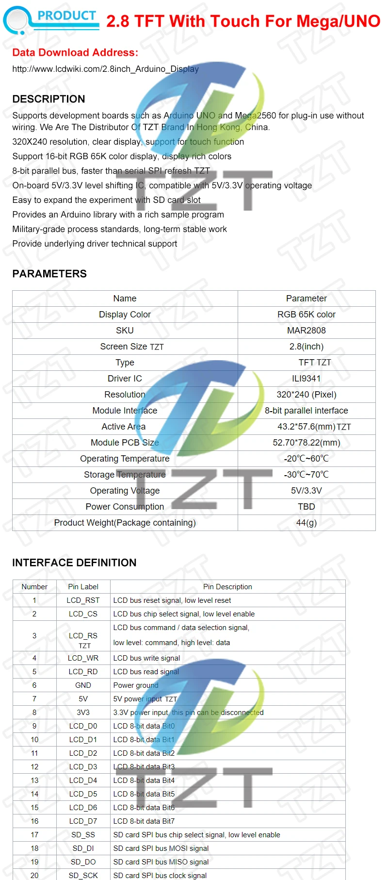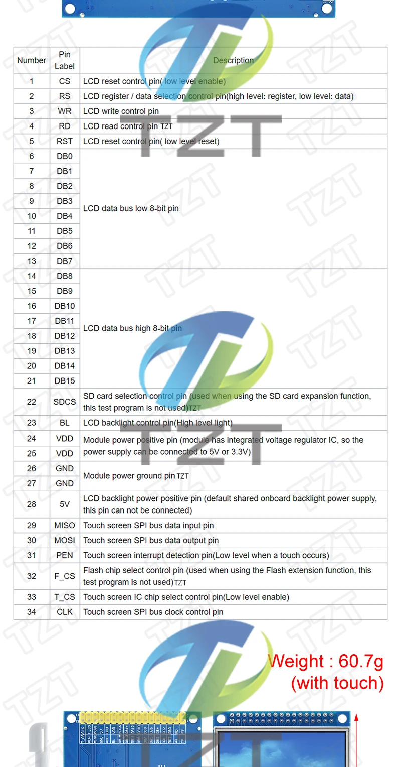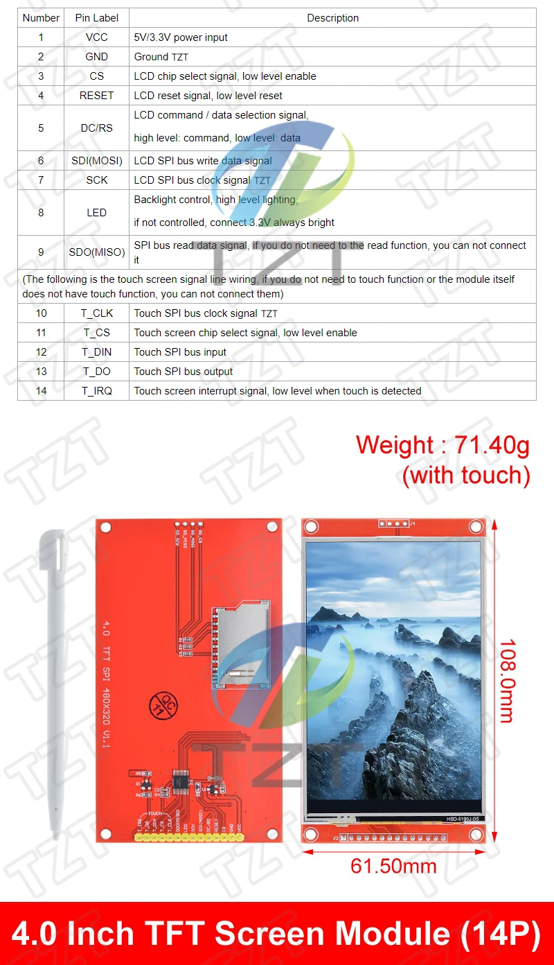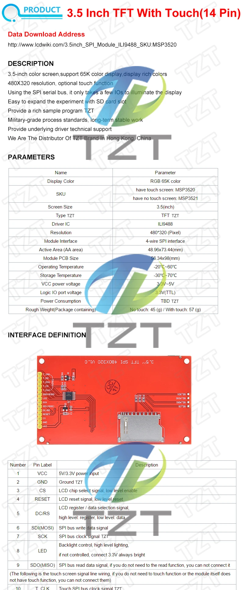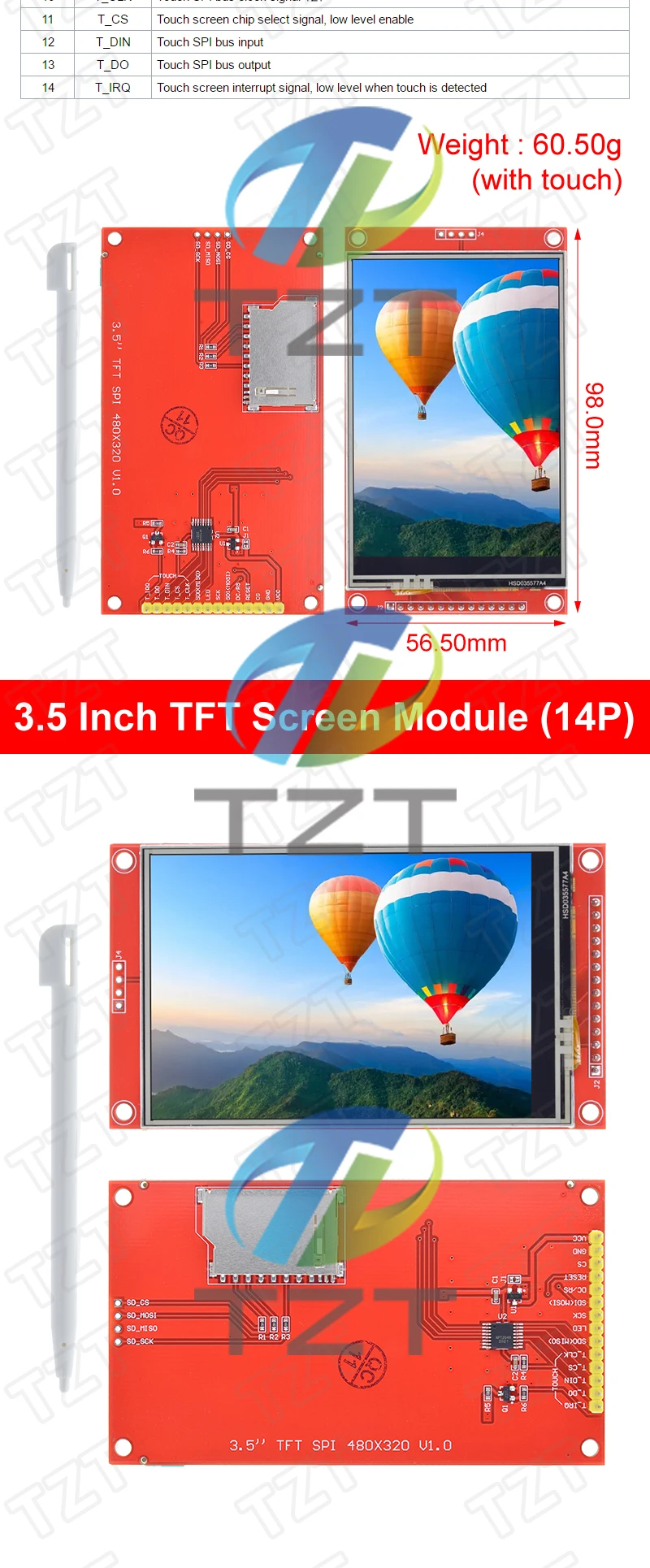 TZT SPI TFT LCD 스크린 다채로운 터치 디스플레이 모듈 인터페이스 SPI ILI9341 ILI9488 480320 240320 2.