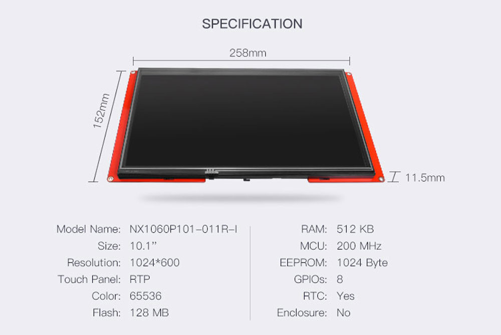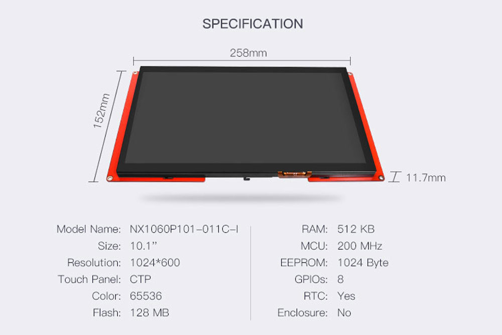 -NX1060P101-011C-I (10.1 인치 IPS RGB 65 K 정전식 터치 스크린), NX1060P101-011R-I (10.1 인치 IPS RGB 65 K 저항 터치 스크린)-내장 된 200 MHz MCU와 HMI 프로젝트를위한 최대 128 MB-내장 RTC... EEPROM 8 디지털 GPO (2 PWM 가능) -4 핀 (+ 5 V TX RX GND) TTL, 직렬 인터페이스-1% 간격 조절이 가능한 300 Nit 밝기-CE 및 RoHS와 호환되는 오디오 인터페이스-모델: NX1060P101-011C-I (HMI 정전식 터치 스크린) 및 NX1060P101-011R-I (HMI 러기드 터치 스크린)
