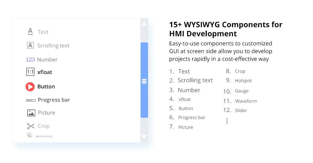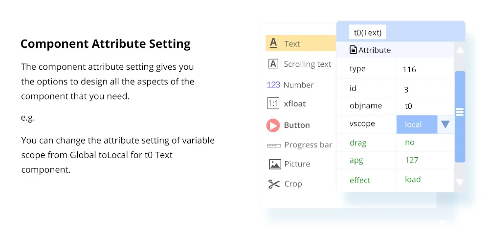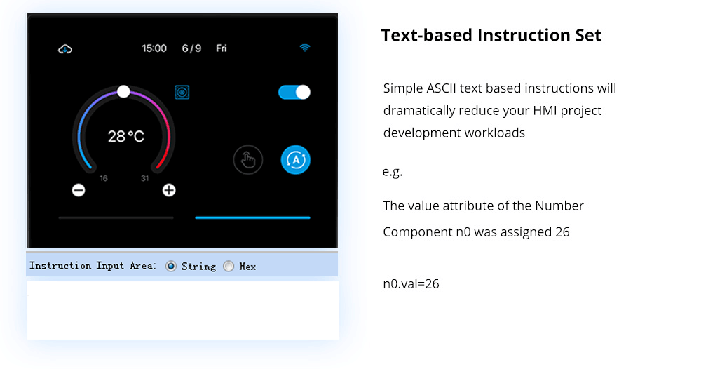 ). Nextion TFT 보드는 하나의 직렬 포트만 사용하여 통신합니다. 그것 사용자들 배선 번거로움 피할 수 있게 해줍니다. 대부분의 엔지니어가 애플리케이션 개발에 많은 시간을 할애하지만 만족스럽지 못한 결과를 얻고 있습니다. 이러한 상황에 대한 해결책으로 Nextion 편집기에는 버튼, 텍스트, 진행률 막대, 슬라이더, 계기판 등과 같은 대량 구성 요소가 있어 인터페이스 디자인을 풍부하게 합니다. 또한 드래그 앤 드롭 기능을 통해 사용자는 프로그래밍에 소요되는 시간을 줄일 수 있으므로 개발 워크로드의 99% 줄일 수 있습니다. 이 WYSIWYG 편집기의 도움으로 GUI를 디자인하는 것은 식은 죽 먹기입니다.