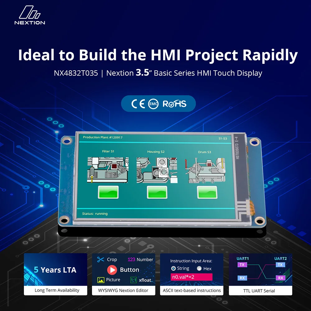 3.5 "기본 NX4832T035 HMI TFT 지능형 디스플레이 모듈은 Nextion 제품군의 회원인 강력한 3.5" HMI입니다. 특징은 다음과 같습니다: 3.5 "TFT 480x320 저항 터치 스크린 디스플레이, 16M 플래시, 3.5KByte RAM, 65k 색상.