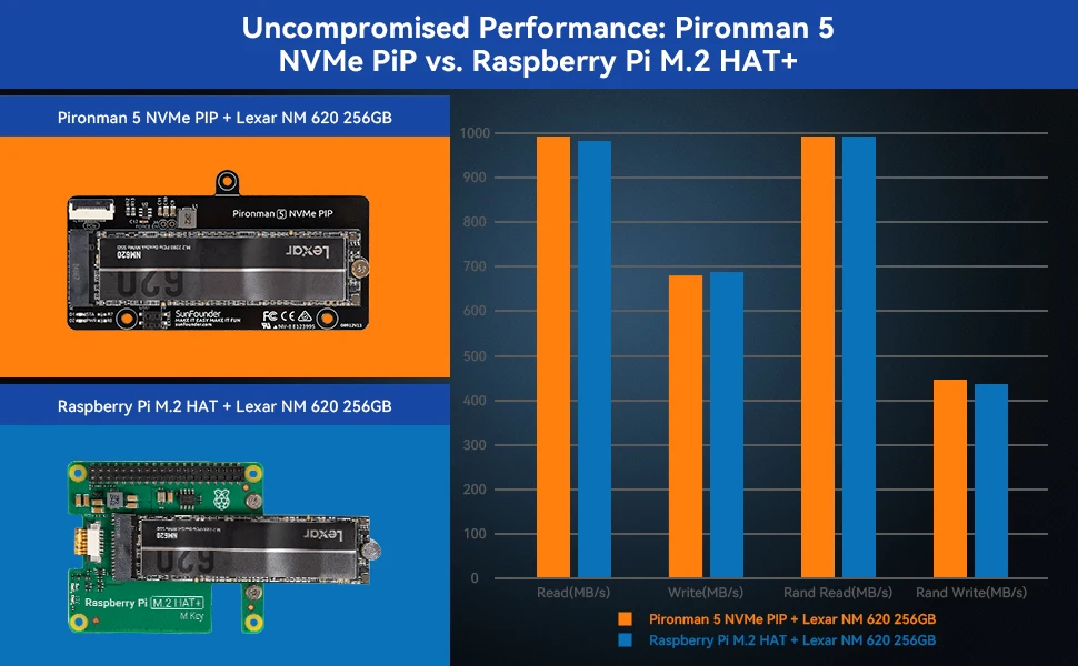 Pironman 5 에는 Pi5 NVMe PIP가 포함됩니다. (PCIe 주변 장치 보드), NVMe 솔리드 스테이트 드라이브 용으로 특별히 설계된 PCIe 어댑터 보드. 이 보드는 네 가지 크기의 NVMe SSD (2230, 2242, 2260, 2280) 를 지원하며, 모두 M.2 M 키 슬롯에 설치할 수 있습니다. 연결은 Gen 2.0 속도 (5 GT/초) 로 인증되었지만 더 빠른 성능을 위해 Gen 3.0 (10 GT/초) 로 강제 연결할 수 있습니다.