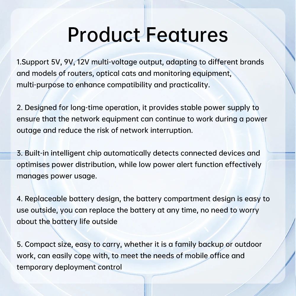 1. 라우터, 광학 모뎀 및 다양한 브랜드 및 모델의 모니터링 장비에 적합한 5V, 9V, 12V 다단계 전압 출력 지원, 여러 용도로 사용되는 하나의 기계, 호환성 및 실용성 향상