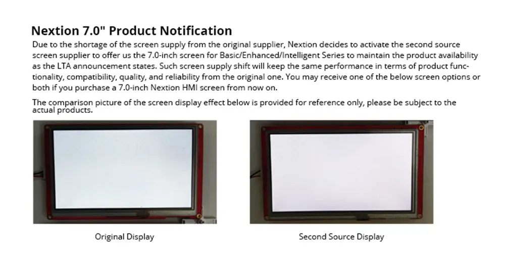 원래 공급 업체의 스크린 공급 부족으로 인해 nextation은 LTA 발표에 명시된 바와 같이 제품 가용성을 유지하기 위해 기본/향상된/지능형 시리즈의 7.0 "인치 스크린을 제공하기 위해 두 번째 소스 스크린 공급 업체를 활성화하기로 결정합니다. 이러한 화면 공급 이동은 제품 기능, 호환성, 품질 및 안정성에 대한 성능 조건을 원래와 동일하게 유지합니다.