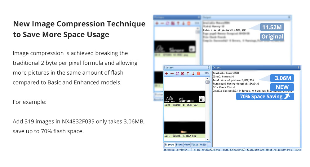 이미지 압축은 기존의 픽셀당 2 바이트 공식을 깨고 기본 및 고급 모델과 비교하여 동일한 양의 플래시에서 더 많은 사진을 허용합니다.
