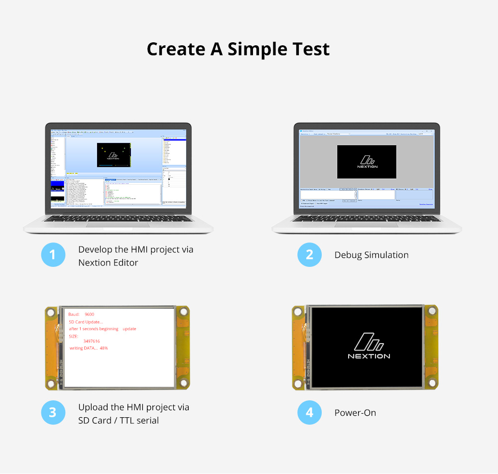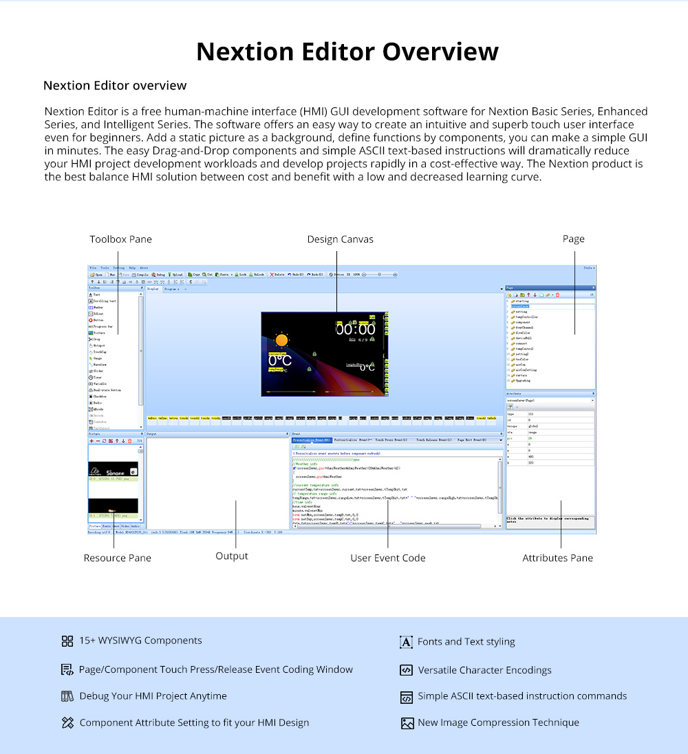 Nextion Editor는 Nextion Basic 시리즈, 향상된 시리즈 및 지능형 시리즈를 위한 무료 HMI (휴먼-머신 인터페이스) GUI 개발 소프트웨어입니다. 이 소프트웨어는 초보자도 직관적이고 뛰어난 터치 사용자 인터페이스를 쉽게 만들 수있는 방법을 제공합니다. 정적 그림을 배경으로 추가하고 구성 요소별로 기능을 정의하면 몇 분 안에 간단한 GUI를 만들 수 있습니다. 간편한 드래그 앤 드롭 구성 요소와 간단한 ASCII 텍스트 기반 지침을 사용하면 HMI 프로젝트 개발 워크로드를 크게 줄이고 프로젝트를 비용 효율적으로 신속하게 개발할 수 있습니다. Nextion 제품은 학습 곡선이 낮고 감소한 비용과 이익 간의 최상의 균형 HMI 솔루션입니다.