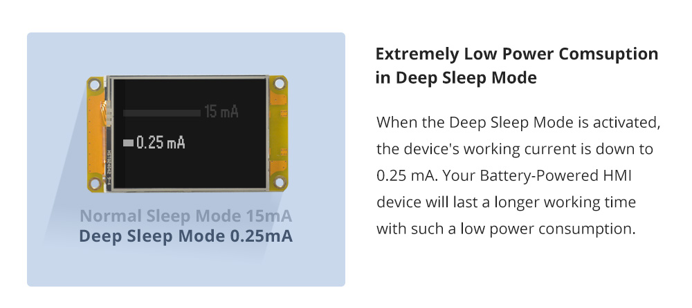 딥 슬립 모드가 활성화되면 장치의 작동 전류는 025mA 로 내려갑니다. 배터리 구동 HMI 장치는 이러한 저전력 연소로 더 오래 작동합니다.