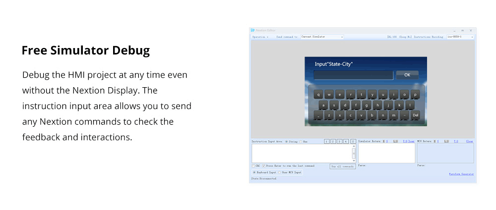 Nextion Display 없이도 언제든지 HMI 프로젝트를 디버그합니다. 명령 입력 영역에서는 Nextion 명령을 전송하여 피드백 및 상호 작용을 확인할 수 있습니다.