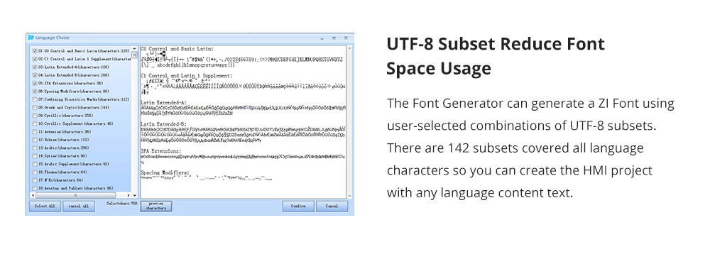 글꼴 생성기는 사용자가 선택한 UTF-8 하위 집합 조합을 사용하여 ZI 글꼴을 생성할 수 있습니다. 모든 언어 문자로 구성된 142 하위 집합이 있으므로 모든 언어 콘텐츠 텍스트로 HMI 프로젝트를 만들 수 있습니다.