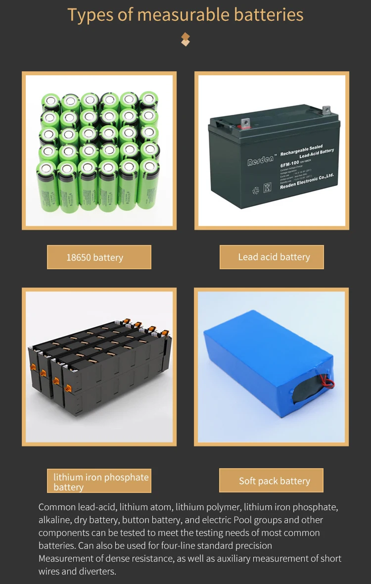 배관 산, 리튬 이온, 리튬 폴리머, 인산 리튬 철, 알칼리, 니켈 수소, 니켈 카드뮴, 버튼 배터리 등을 측정 할 수 있습니다.
