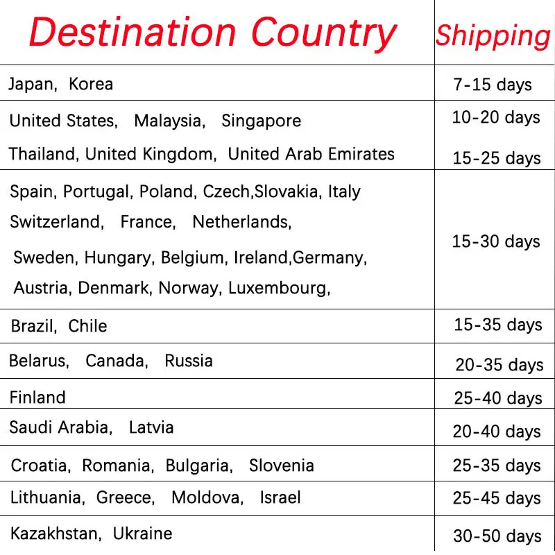 1. 일반적으로 공휴일을 제외하고 결제 후 영업일 기준 1-2 일 이내에 상품을 발송합니다. (배터리를 배송하기 전에 배터리를 테스트해야하기 때문에) 2. 확인된 주문 주소로만 배송합니다. 주소, 전화 번호, 우편 번호는 상세하고 정확해야 합니다. 주문 주소는 배송 주소와 일치해야 합니다. 3. 우리 모두 알다시피, 배터리는 위험물이기 때문에 순수한 배터리 팩 배송 시간은 일반 제품보다 길다. (일부 국가는 항공으로 운송 할 수 없습니다.) 패키지의 배송 시간은 보통 10-50 일입니다. 4. 위 국가의 배송 시간은 약속 한 배송 시간이 아니라 우리가 제공 한 참조 시간입니다. 5. 오랫동안 패키지를받지 못했다고해서 패키지를 잃어버린 것은 아닙니다. 소포가 현지 우체국이나 우편함에 도착했을 수 있습니다. 6. 패키지 추적 정보는 다음 웹사이트를 통해 대부분의 국가에서 확인할 수 있습니다. 쿼리하기 위해 지정된 웹 사이트를 요구하는 국가도 있습니다. 패키지 추적 정보를 찾을 수 없으면 고객 서비스에 문의하십시오. 7. 추적 URL: https://www.17track.net/en 8. 확인 시간이 다가오더라도 여전히 상품을 받지 못했습니다. 저희에게 연락하십시오. 처음 배송 날짜를 연장해 드리겠습니다.