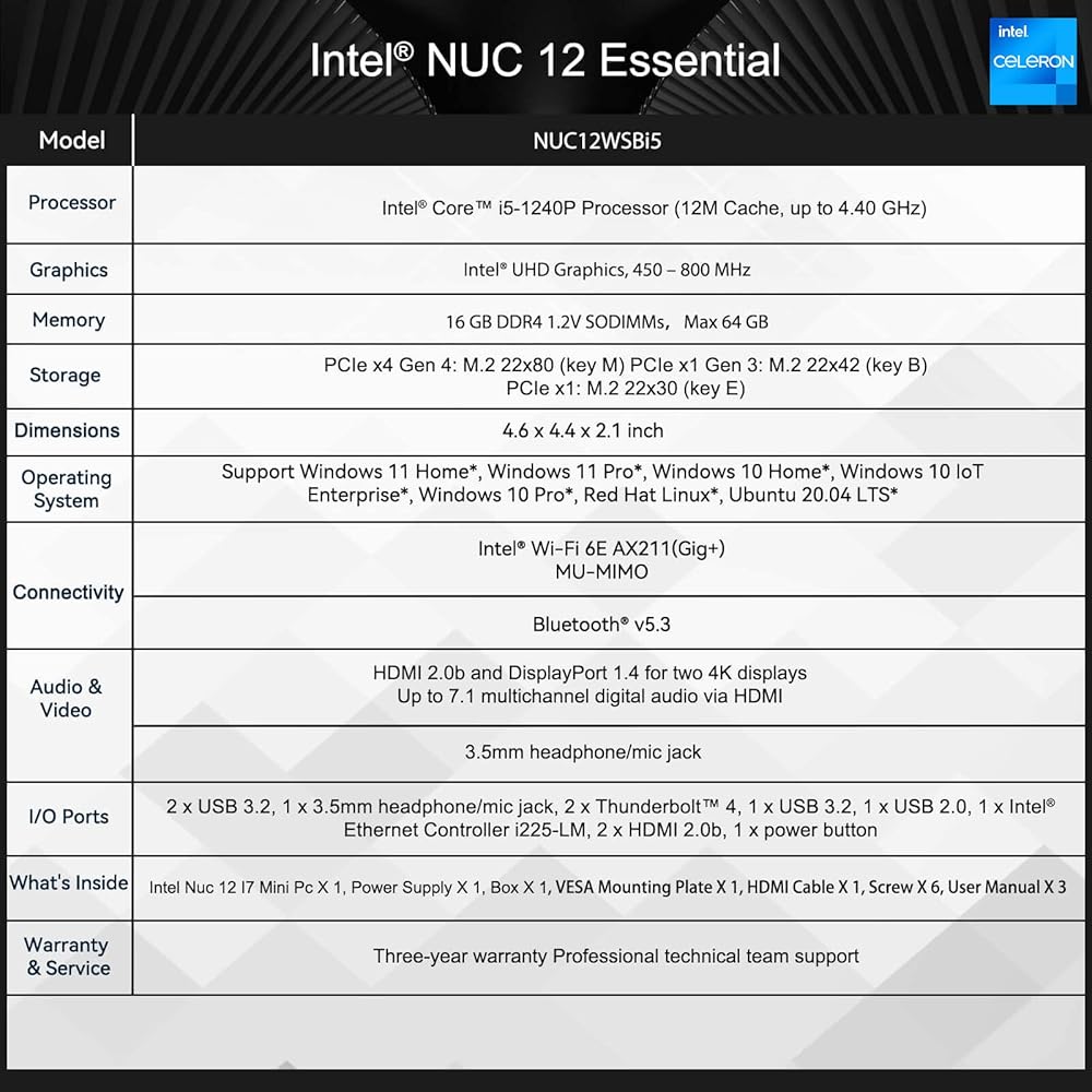 인텔 NUC 12 Pro 비즈니스 미니 데스크톱 인텔 코어 i5-1240P(12C/16T 최대 4.4GHz) 미니 PC 16GB DDR4 RAM